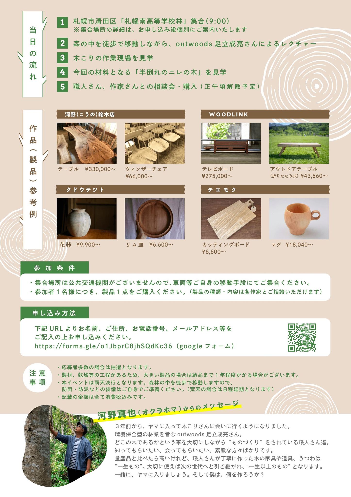 学校林ですでに倒れかけているハルニレの木を、伐採するところからお客様(=イベント参加者)に見ていただき、その木を使ってお客様が欲しいモノをお客様と作り手が相談しながら製作する、という企画です。